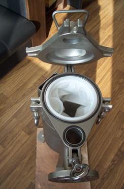 3、放置濾袋,使濾袋環(huán)口和金屬內(nèi)網(wǎng)領(lǐng)口吻合。注意:如果使用的是車縫濾袋,請(qǐng)將濾袋的車縫邊折疊后放入,可以提高車縫濾袋的過(guò)濾效果。